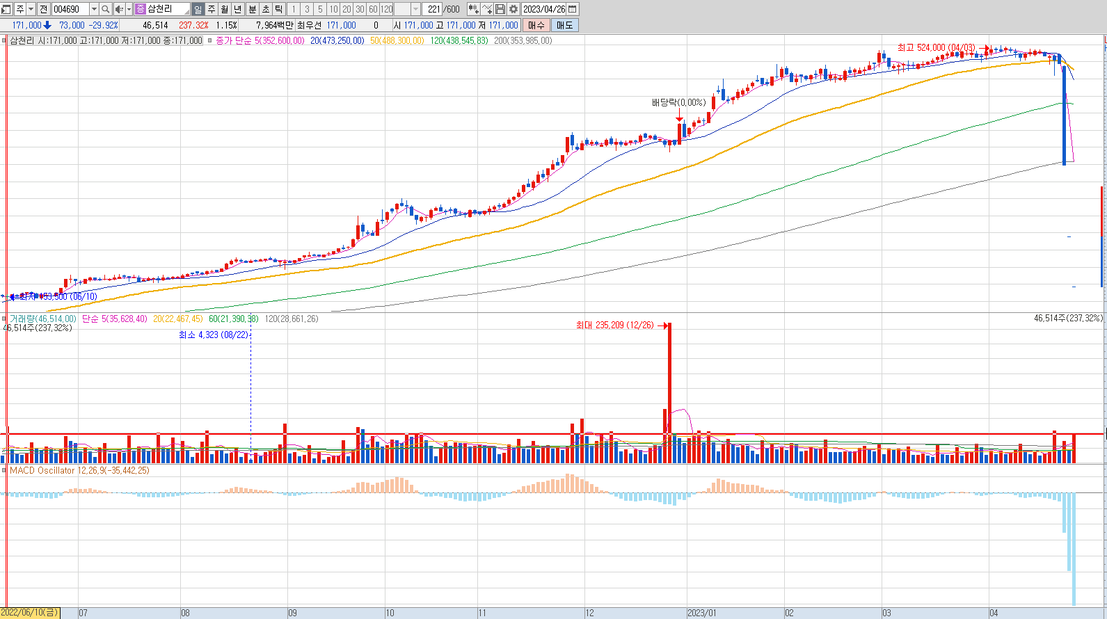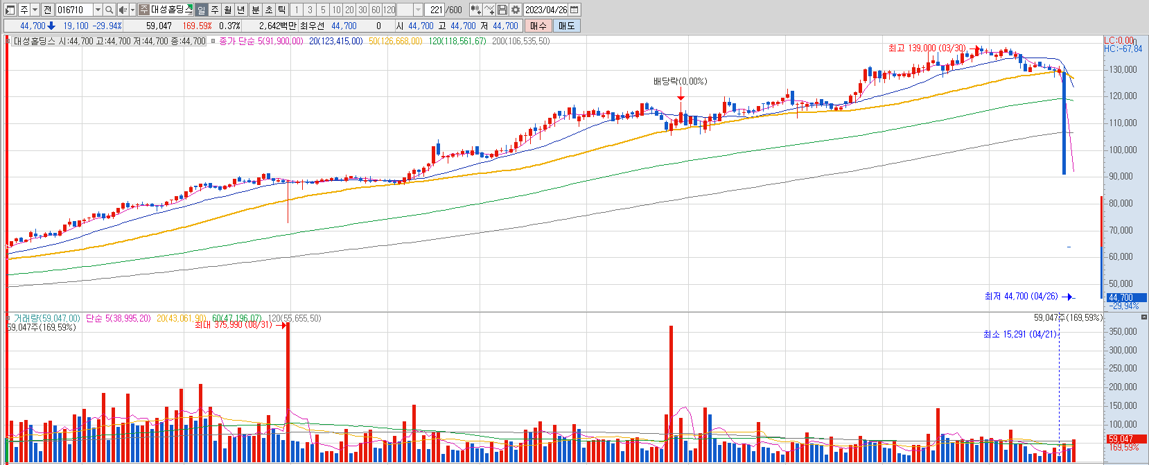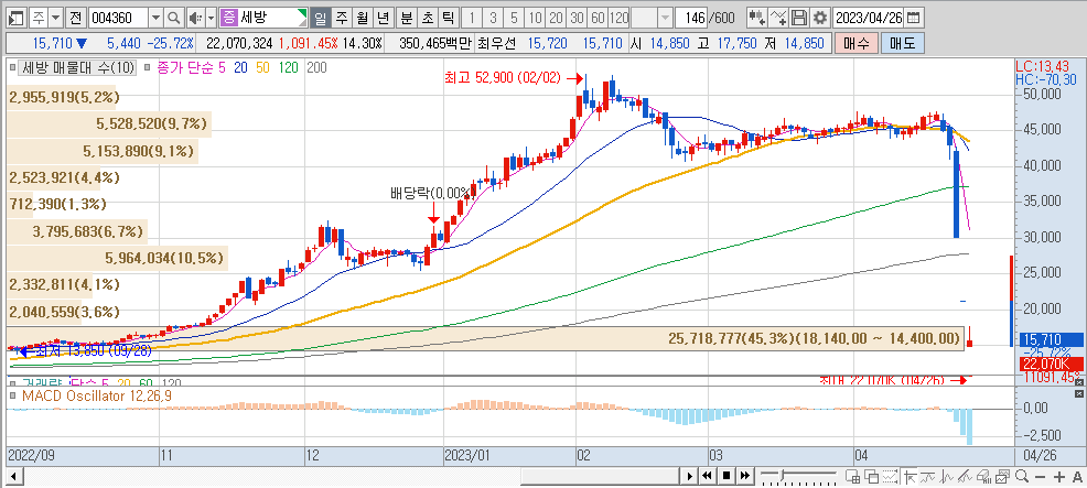 통정거래로 몇년을 이끌었다는 노력도 대단하지만, 역시 작전세력의 탈출은 거래량이 없는 종목에서는 꺽이면 답이 없다는 점을 보여줍니다.