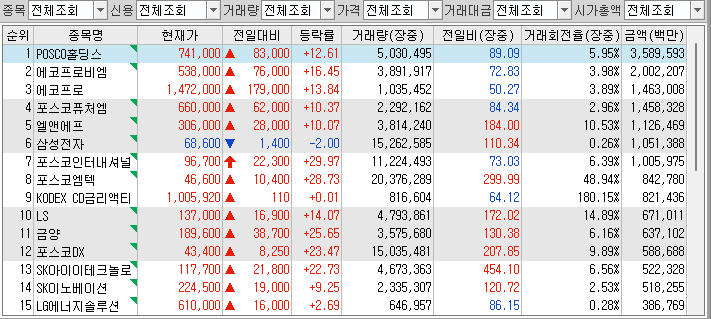 기껏 10~15조 거래의 시장에서 12시 경 10조이상이 2차전지만 바라봅니다.