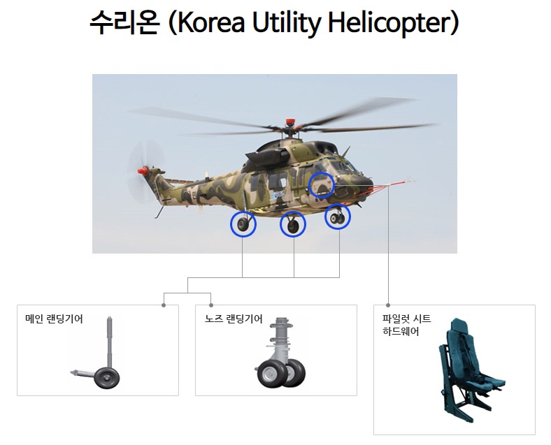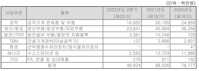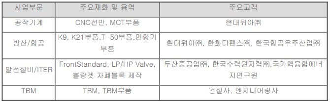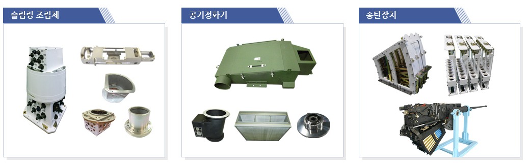 | 한국형신형자주포(K-9)용 "탄약 운반장치", 차기보병장갑차(K-21)용 "차보송탄장치","Pre-Cleaner", 한국공군고등훈련기(T-50)용 "Door Actuator", "랜딩기어","탄저장이송장치 Ammunition Ass'y","유압저장조 Reservoir", 해상용 함포부품 A'ssy, KUH(수리온)용 랜딩기어, Pilot Seat, 연대급 및 중대급 과학화 훈련 장비 15여 종 등을 포함한 육상, 항공, 해상용 방산시스템 부품을 국산화 개발하여 장기적인 계약물량을 확보하고 양산 납품 중에 있으며, 연차적으로 생산 품목 및 규모가 확대 추세에 있습니다 육상부문에서는 한국군의 10대 명품 무기중의 하나인 K-9 자주포의 격발기조립체, 지지대, 장전기, 크레들 조립체 및 K-10 탄약 운반차의 탄통구조물, K-21 차기보병장갑차의 송탄시스템을 생산하고 있습니다. 당사는 그 동안의 단품 생산에서 벗어나 K-21 차기보병장갑차의 공기정화기 등과 같이 Sub-Ass’y로 사업범위를 넓혀 가고 있으며, 신규로 K-1 전차의 교체용 포열을 생산/납품하는 등 신 규사업을 강화하고 있습니다. 항공부문에서는 T-50 고등훈련기의 Door Actuator, 랜딩기어 부품과 함께 한국형 헬기인 수리온의 랜딩기어부품을 생산하고 있습니다 |